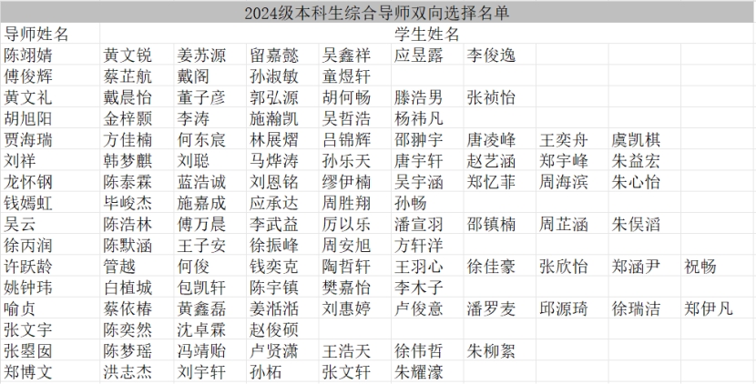 经2024级本科生、综合导师双向选择以及学院综合协调,2024级本科生综合导师的具体名单现公布如下表(按姓名首字母排序)。请各位同学在本名单公布一周内主动与导师联系,以便相关指导工作的顺利开展。